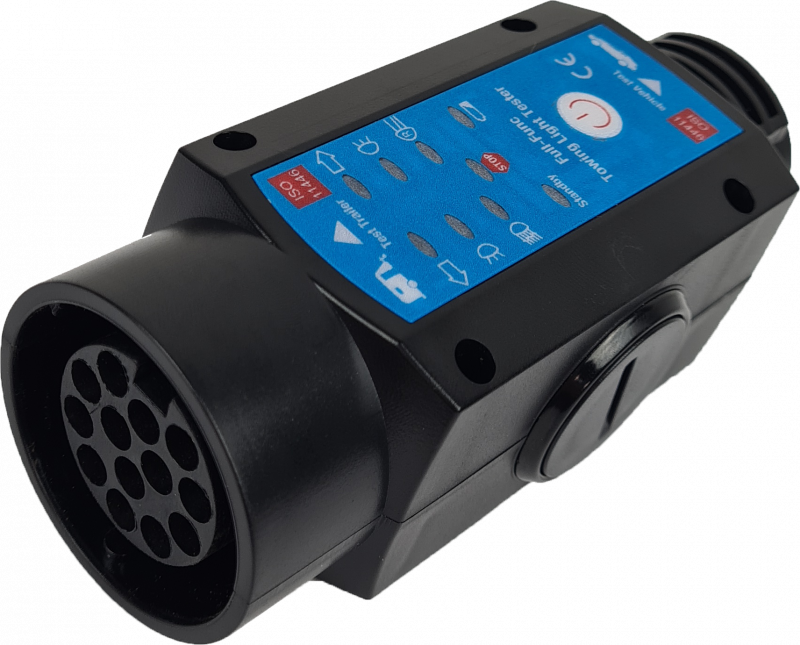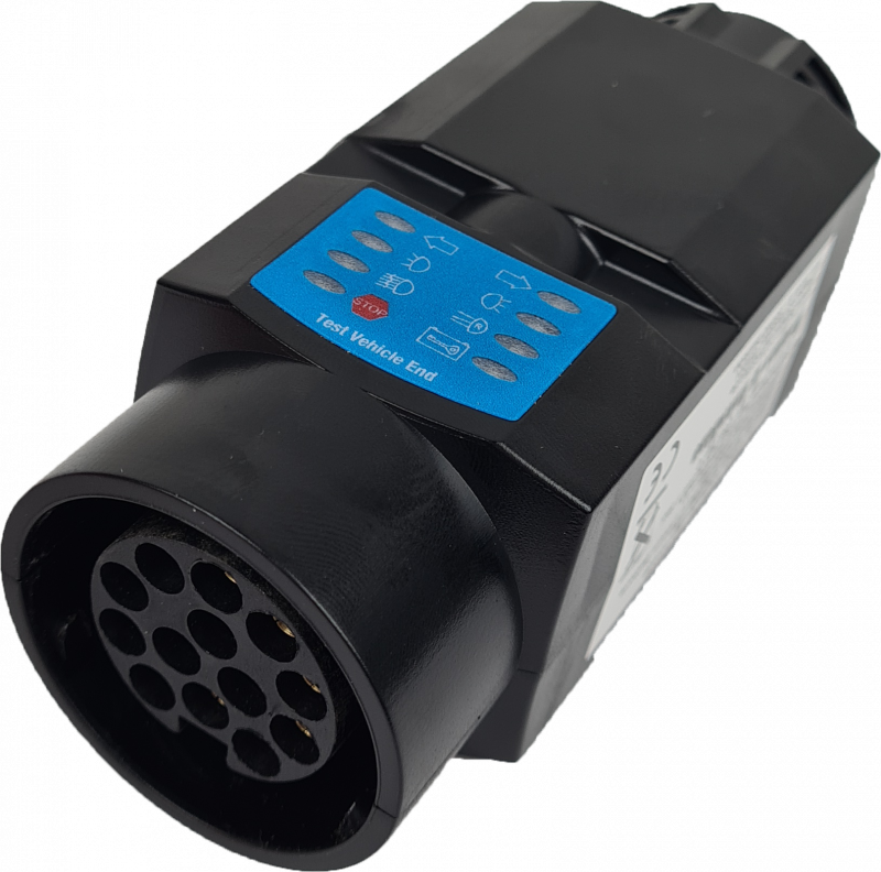 Dieses LED-Prüfgerät testet alle verkehrswichtigen Beleuchtungsfunktionen an Fahrzeug-Anhängerdosen und -Anhängersteckern mit ISO11446.