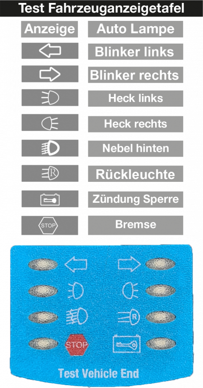Testbare Funktionen-- Blinker links / rechts, Bremsleuchte, Rück-/ Schlussleuchte links / rechts, Nebelschlussleuchte