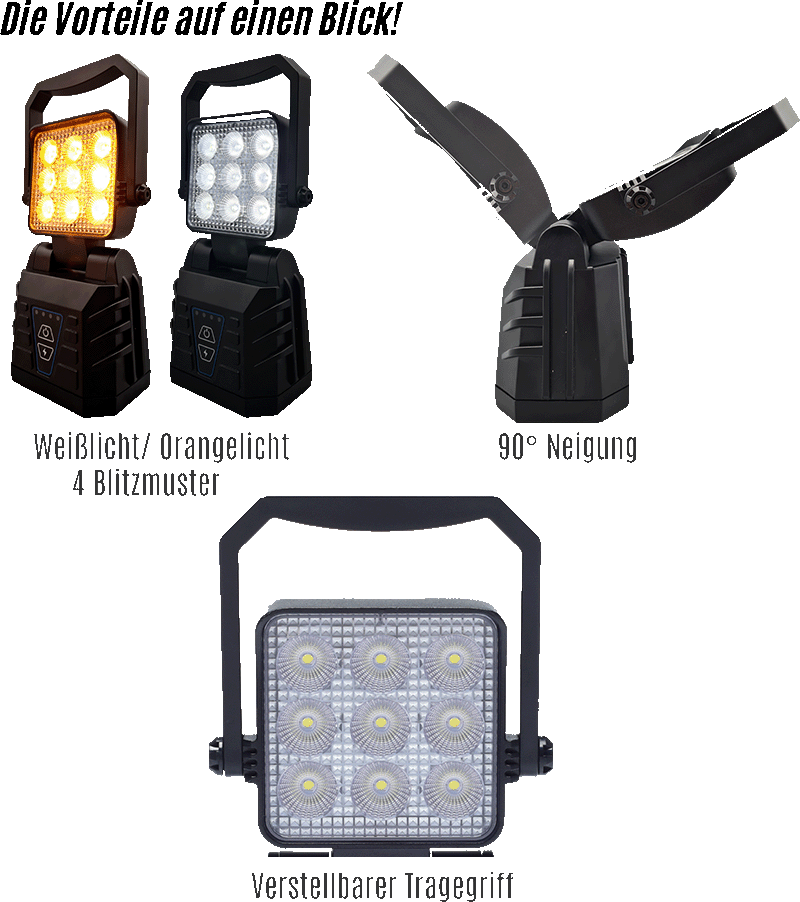 Sicherer Halt dank Magnetfuß, flexibel ausrichtbar durch 90°-Neigung und Tragegriff.