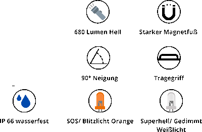 Zwei Weißlichtstufen sowie orangefarbenes Warnlicht mit Stroboskop-, Blitz- und SOS-Modus.