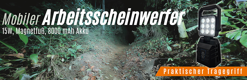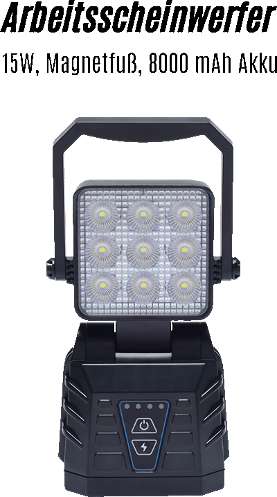 Der mobile LED-Arbeitsscheinwerfer mit Akku ist die perfekte Lichtlösung für Werkstatt, Baustelle, Garage, Kfz-Arbeiten, Camping und Outdoor. Mit 15 Watt, 9 Hochleistungs-LEDs und 680 Lumen sorgt er für optimale Ausleuchtung.