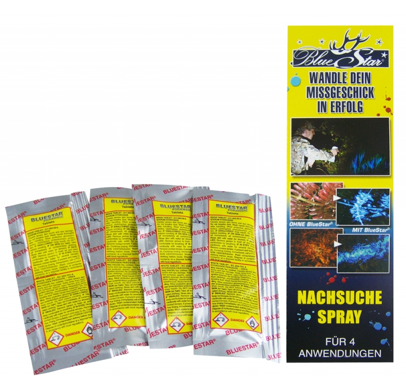 Bluestar Schweißfinder Nachfüllpack für 125 ml! Damit Sie bei Nacht schnell den Anschuss finden! Welcher erfolgreiche Jäger kennt das nicht: Das Stück ist getroffen, trotzdem liegt es nicht und es ist kein Schweiß sichtbar, da hilft Bluestar Schweißfinder! Es macht den Schweiß blau leuchtend in der Dunkelheit sichtbar, auch bei Regen! Selbst kleinste Spuren werden schnell gefunden. Problemlos lassen sich so Spuren bis zu 100m verfolgen. Einfach zwei Tabletten Bluestar in 125ml Wasser auflösen, schütteln - fertig! Nachfüllpack bestehend aus 4 x 2 Tabletten für dann insgesamt 500 ml.