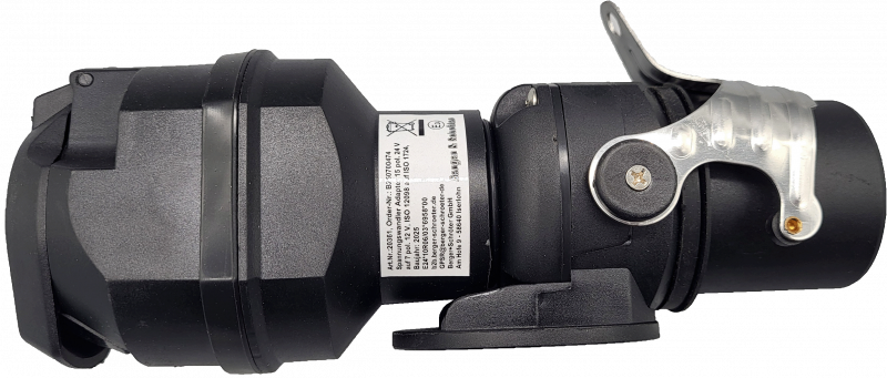 Spannungswandler Adapter 15 pol. 24 V auf 7 pol. 12 V, Spannungsreduzierer, 24 V LKW Zugfahrzeug auf 12 V Anhänger, ISO 12098 auf ISO 1724, E24*10R06/03*6958*00 max. 70 W, Adapter arbeitet nur unter Last, für Fahrzeuge mit und ohne CAN BUS empfohlen für Glühlampen und für LED