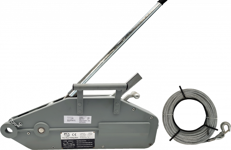Endlos Seilzug, 1600 kg, für theoretisch endlose Drahtseile, GS geprüft sicheres Ziehen, Vorschub 28 mm, für Drahtseile mit 11 mm Durchmesser, ca. 26,5 kg Eigengewicht, notwendige Bedienkraft ca. 438 N. Incl. 20 m Seil.